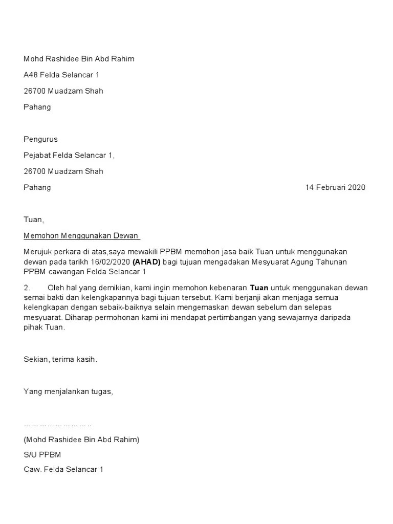 Surat Rasmi Memohon Kebenaran Menggunakan Dewan / Contoh Surat Tempahan Dewan Pdf